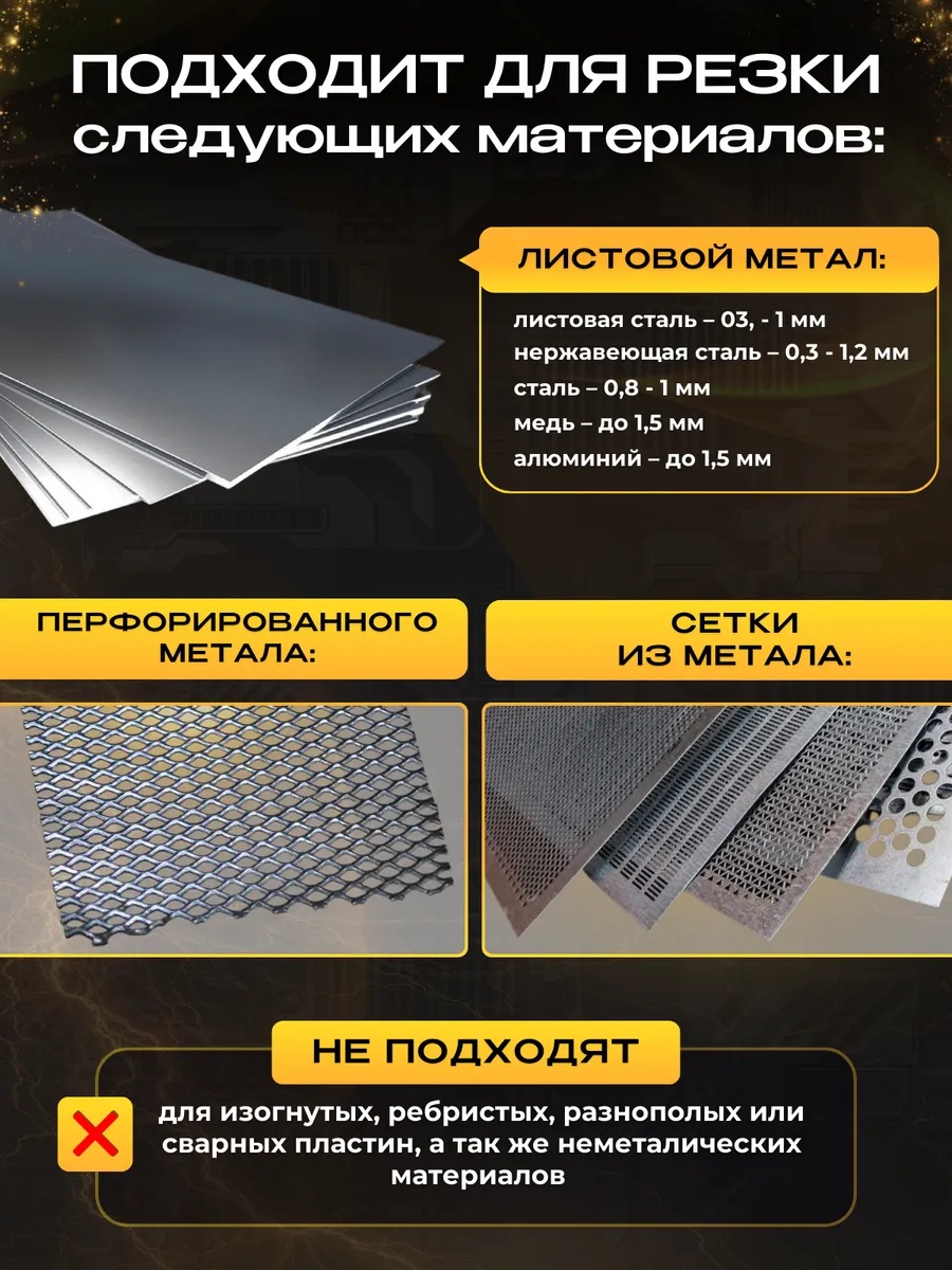 Ножницы металлические подходят для резки следующих строительных материалов: листовой металл: листовая сталь – 0,3-1 мм, нержавеющая сталь – 0,3-1,2 мм, сталь – 0,8 – 1 мм, медь – до 1,5 мм, алюминий – до 1,5 мм; сетки из металла; перфорированный металл, профлист, гвл.